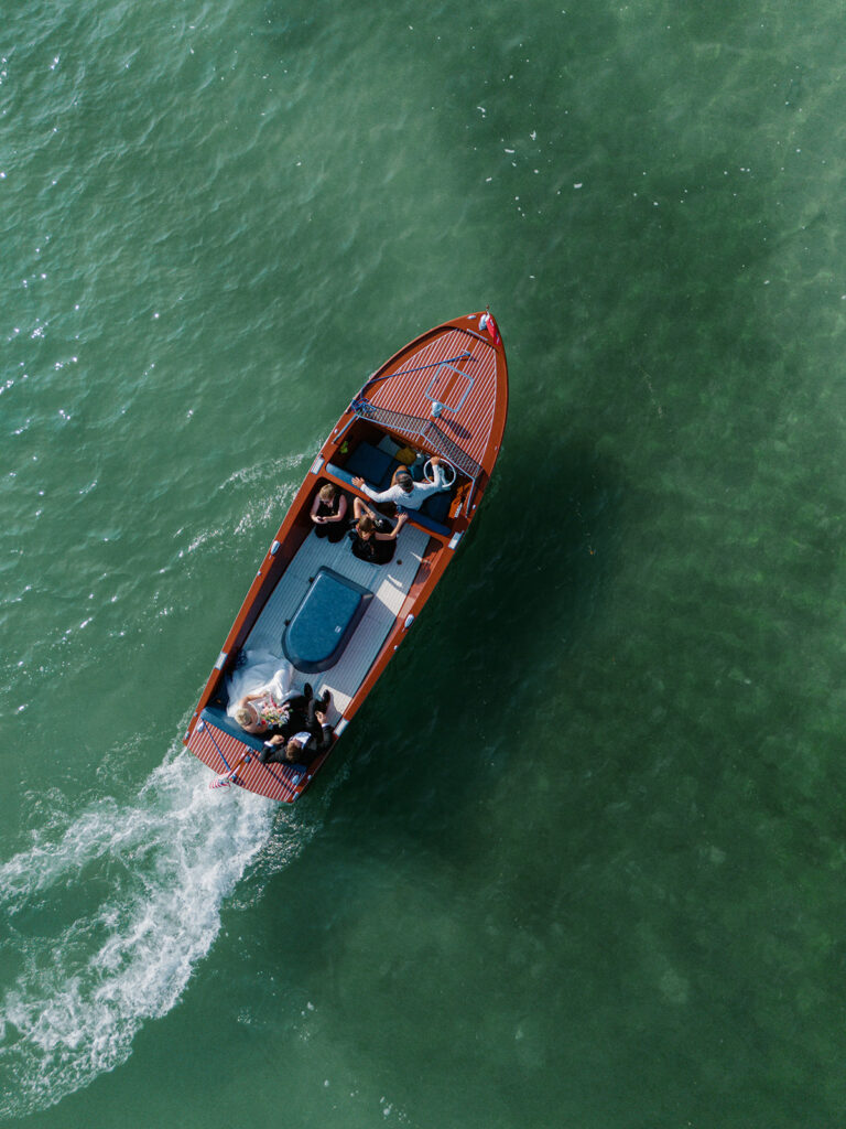 The ceremony took place just steps from the water, framed by soft summer florals in a romantic pastel palette. After saying “I do,” the couple made their grand getaway on a vintage wooden boat, complete with sunglasses, champagne, and wide smiles. The ride was pure magic—effortless and joyful, like something out of a timeless film.