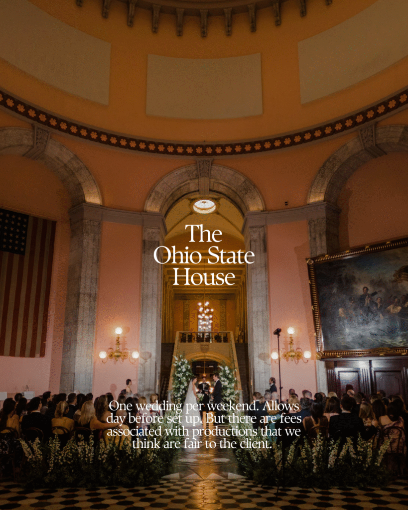 The Ohio Statehouse is iconic for a reason. Architecturally stunning and undeniably grand, it offers a rare level of exclusivity with one wedding per weekend, allowing for day-before setup—a major win for planners managing complex productions.