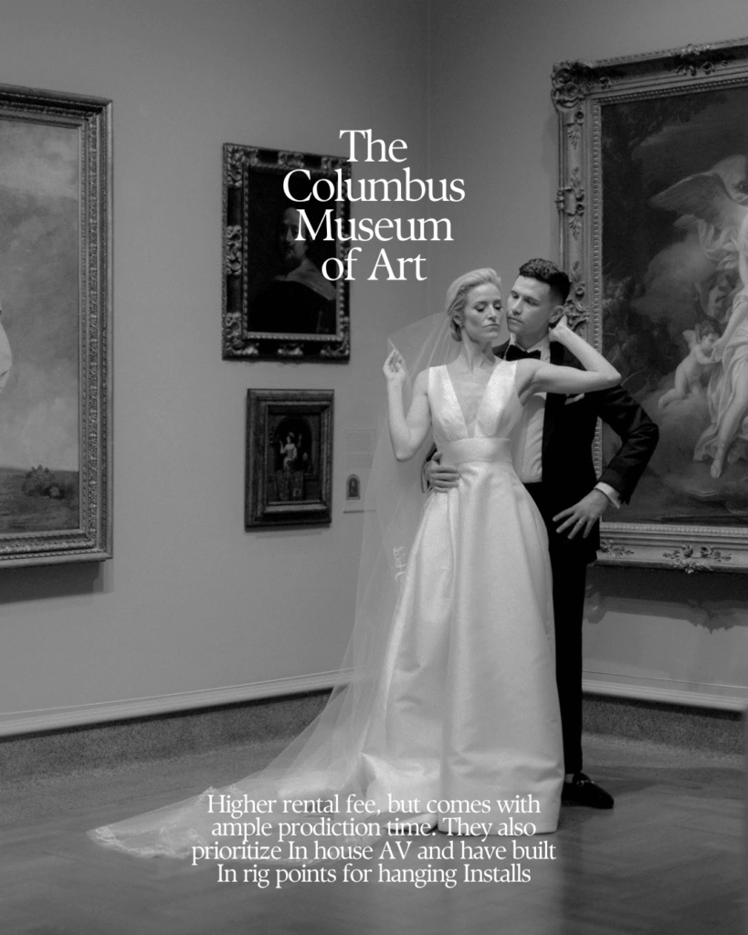 For couples who value creativity and intentional design, the Columbus Museum of Art offers a refined yet flexible canvas. While the rental fee is higher, it comes with ample production time, built-in rigging points, and an emphasis on in-house AV, which simplifies logistics.