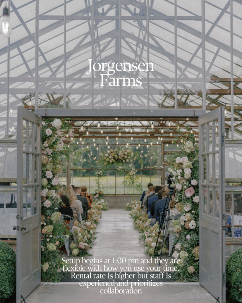Jorgensen Farms is a favorite for planners who want flexibility without sacrificing polish. Setup typically begins at 1:00 pm, and the team is collaborative and accommodating in how time is used throughout the day.